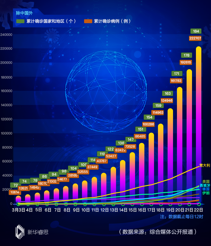 根據(jù)世界衛(wèi)生組織22日公布的最新數(shù)據(jù),中國(guó)以外新冠肺炎確診病例20多萬(wàn)。目前,歐洲已成為疫情“震中”,美國(guó)宣布進(jìn)入“國(guó)家緊急狀態(tài)”,中東多國(guó)“封城”,拉美、非洲多國(guó)報(bào)告確診病例……隨著新冠肺炎全球確診病例持續(xù)快速增加,網(wǎng)友對(duì)全球疫情進(jìn)展情況的關(guān)注度迅速升溫。