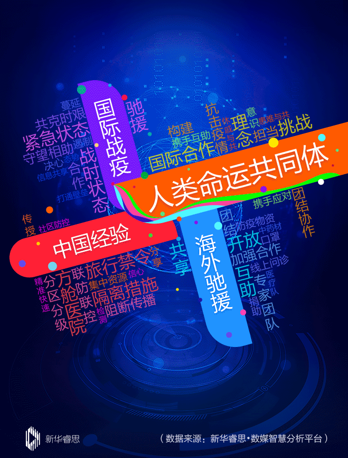 新華睿思持續(xù)跟蹤微博、抖音、今日頭條等網(wǎng)上熱搜榜高熱話題,以及重大新聞事件,梳理出網(wǎng)友關(guān)注的熱詞集錦。根據(jù)關(guān)注度排行可以看出,“人類命運(yùn)共同體”“國(guó)際戰(zhàn)疫”“中國(guó)經(jīng)驗(yàn)”“海外馳援”四個(gè)關(guān)鍵詞位居前列。同時(shí),“國(guó)際合作”“戰(zhàn)時(shí)狀態(tài)”“方艙醫(yī)院”“共享”“開(kāi)放”“互助”等成為熱搜詞匯。