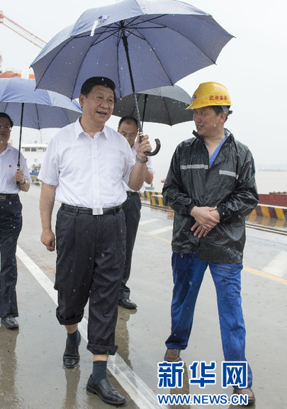 2013年7月21日至23日,中共中央總書記、國(guó)家主席、中央軍委主席習(xí)近平在湖北調(diào)研全面深化改革問題和當(dāng)前經(jīng)濟(jì)運(yùn)行情況。 21日上午,習(xí)近平冒雨來到武漢新港陽邏集裝箱港區(qū)考察。 新華社記者 李學(xué)仁 攝