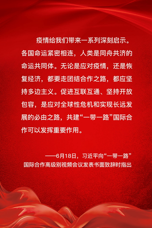 在當前新冠肺炎疫情全球蔓延的特殊背景下,“一帶一路”國際合作高級別視頻會議的舉行,為進一步加強抗疫國際合作和推動高質(zhì)量共建“一帶一路”注入了新動力,也為疫情陰霾中的世界提振了信心、凝聚了正能量。