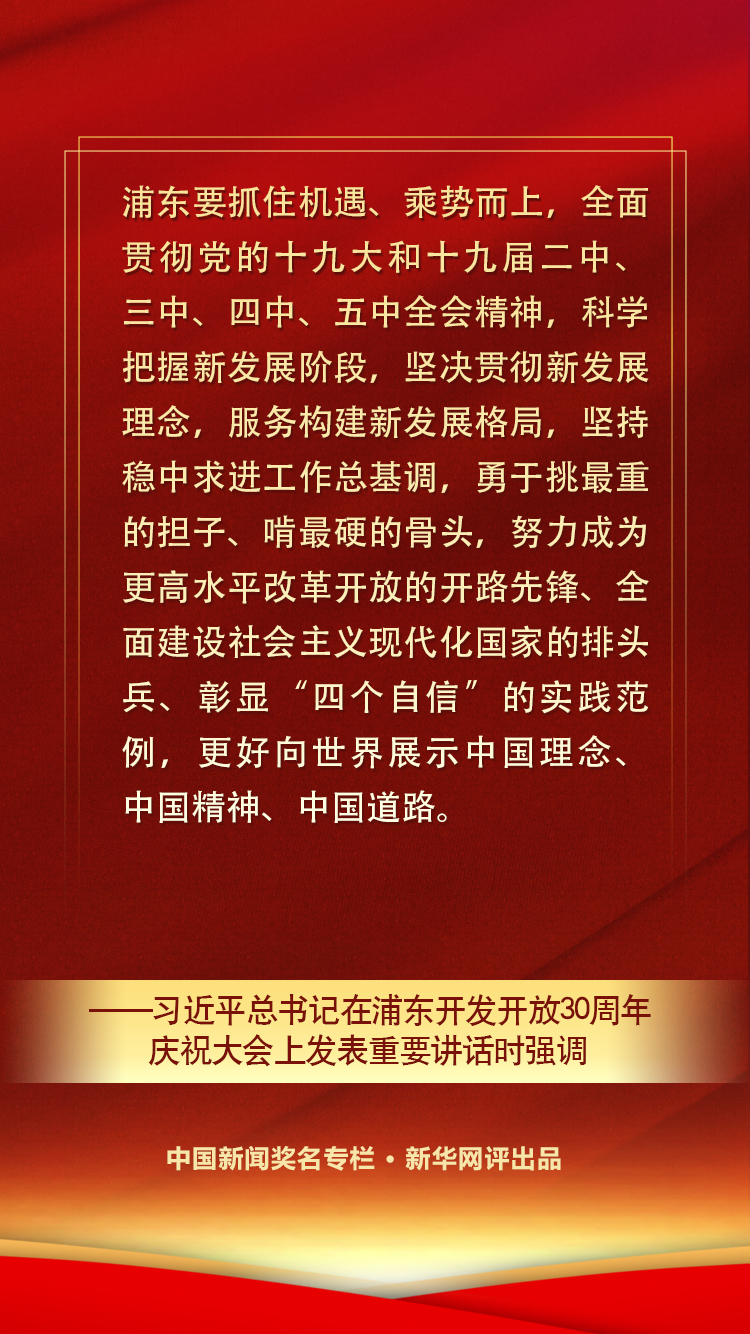 對歷史的最好回望,就是創(chuàng)造新的歷史。而立之年的浦東,正站在奮力打造新時代改革開放新高地的新起點,處處彰顯著勃勃生機和無限活力。要全力做強創(chuàng)新引擎,打造自主創(chuàng)新新高地;加強改革系統(tǒng)集成,激活高質量發(fā)展新動力;深入推進高水平制度型開放,增創(chuàng)國際合作和競爭新優(yōu)勢;增強全球資源配置能力,服務構建新發(fā)展格局;提高城市治理現(xiàn)代化水平,開創(chuàng)人民城市建設新局面……進入新時代,以習近平同志為核心的黨中央繼續(xù)對浦東開發(fā)開放提出明確要求,把一系列國家戰(zhàn)略任務放在浦東,推動浦東開發(fā)開放不斷展現(xiàn)新氣象。新時代再出發(fā),浦東要發(fā)揚敢拼敢闖的勁頭,勇于挑最重的擔子、啃最硬的骨頭,努力成為更高水平改革開放的開路先鋒、全面建設社會主義現(xiàn)代化國家的排頭兵、彰顯“四個自信”的實踐范例,更好向世界展示中國理念、中國精神、中國道路。