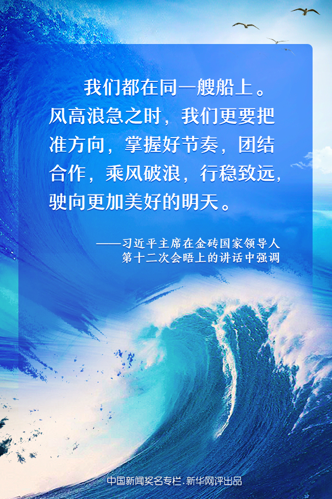 金磚國家領導人第十二次會晤17日晚以視頻方式舉行。習近平主席發(fā)表題為《守望相助共克疫情 攜手同心推進合作》的重要講話時強調(diào),我們都在同一艘船上。風高浪急之時,我們更要把準方向,掌握好節(jié)奏,團結(jié)合作,乘風破浪,行穩(wěn)致遠,駛向更加美好的明天。