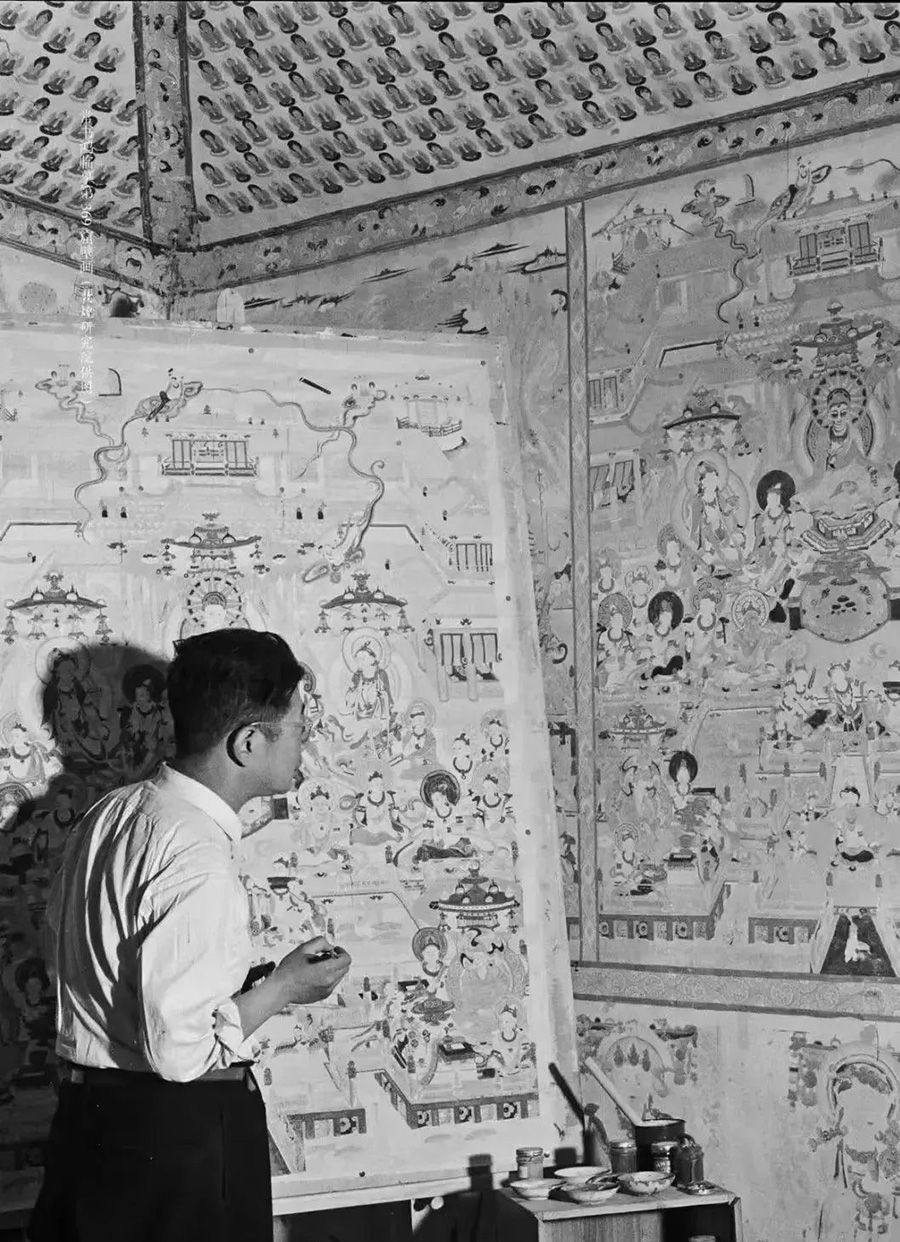 敦煌研究院首任院长常书鸿的女儿常沙娜,这样描述:“建于五代时期的窟檐斗拱上鲜艳的梁柱花纹;隋代窟顶的联珠飞马图案;顾恺之春蚕吐丝般的人物衣纹勾勒;吴道子般吴带当风的盛唐飞天;金碧辉煌如李思训般的用色……我在大漠荒烟中修行着自己艺术人生第一阶段没有学历的学业。”