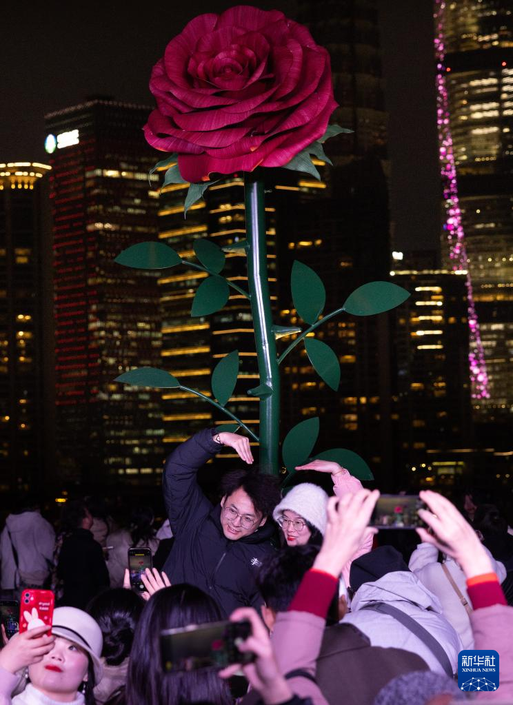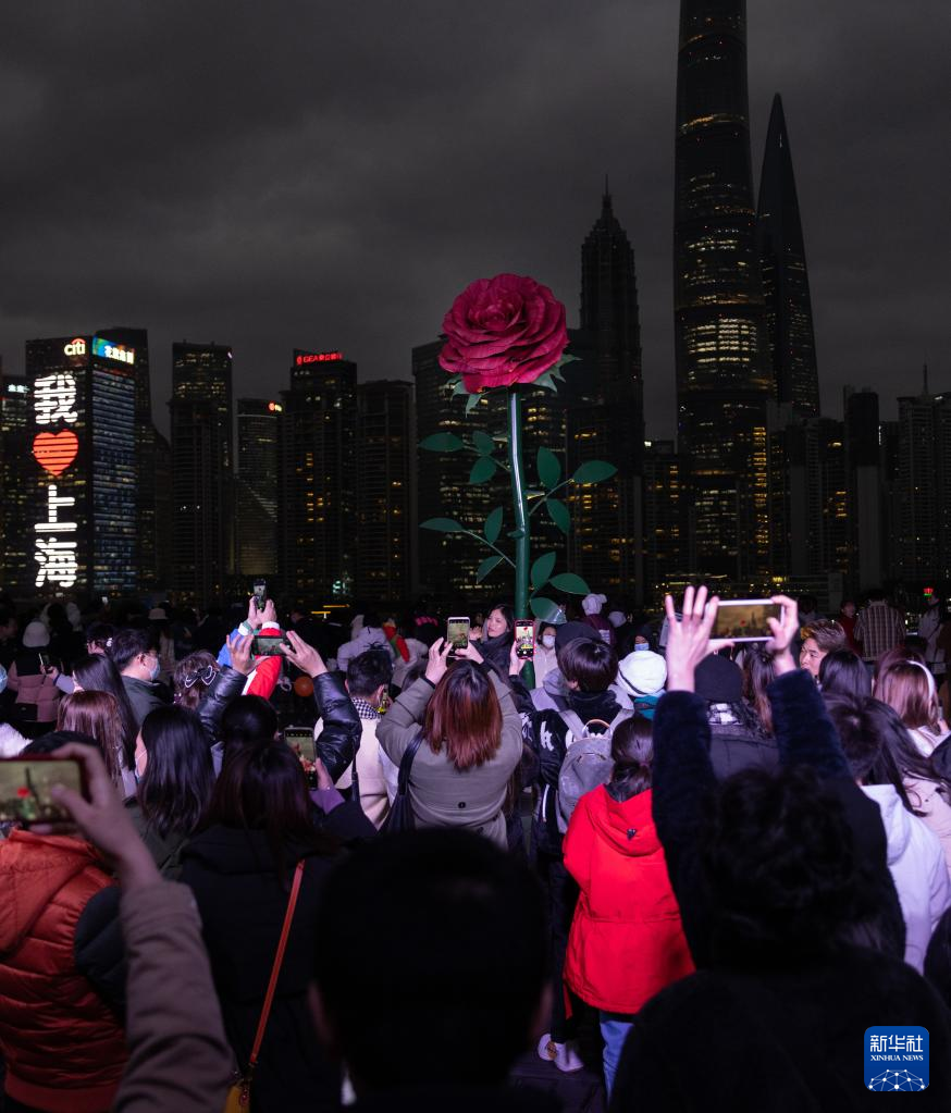 2月14日,市民和游客在高达6米的巨型玫瑰艺术装置前拍照。