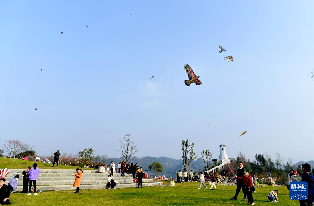 春光明媚,人们踏青出游,放飞风筝,乐享春日美好时光。