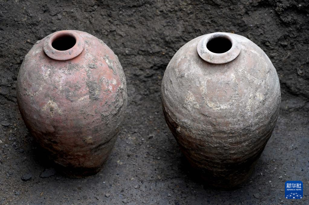 这是宋国故城遗址内的唐代墓葬出土的陶罐(3月25日摄)。