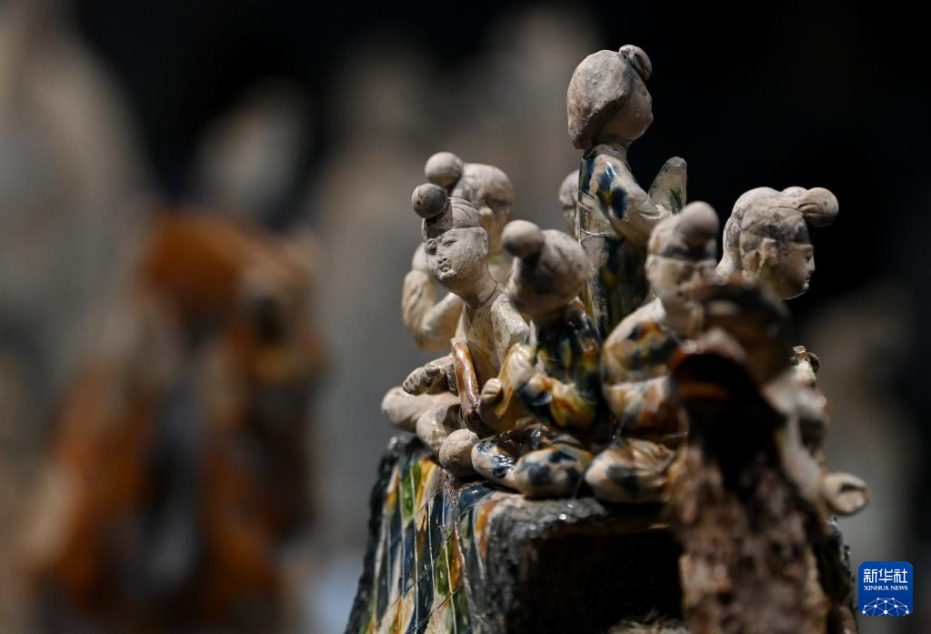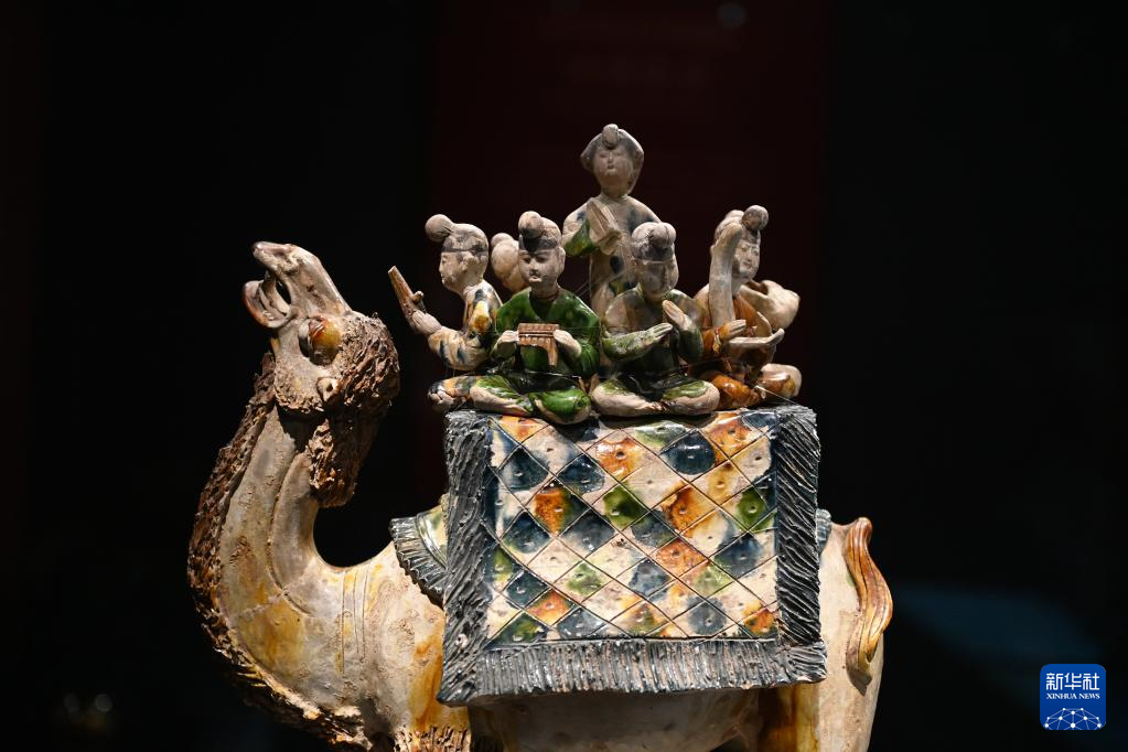这是在陕西历史博物馆拍摄的唐三彩骆驼载乐俑(5月11日摄)。这件唐三彩骆驼载乐俑既是唐代文化艺术、制作工艺发达昌盛的重要物证,也见证了丝绸之路上艺术的交流与融合。