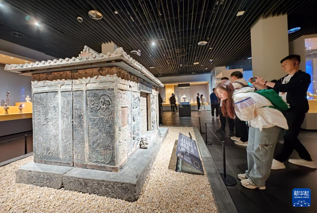 5月8日,游客在西安博物院参观史君墓石椁。墓主史君是北周凉州萨保,粟特人。石椁整体为中国传统歇山顶殿堂式建筑,四壁浮雕内容和风格则带有鲜明的西域特色。