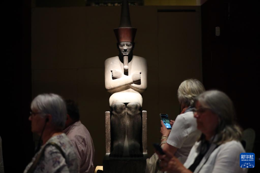 5月16日,在位于埃及首都开罗的埃及博物馆,人们走过古埃及法老门图荷太普二世的坐像。