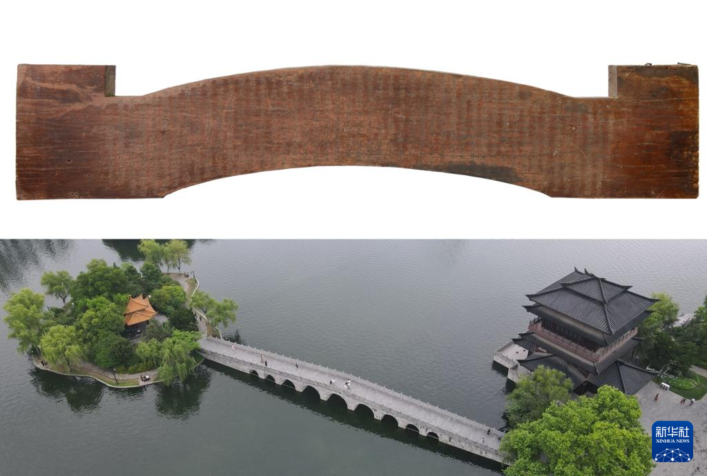 这是一张拼版照片,上图为:《逍遥津木刻枋》,现收藏于安徽博物院(新华社发,吴艳摄);下图为:5月17日拍摄的位于安徽省合肥市的逍遥津公园(无人机照片,新华社记者张端摄)。