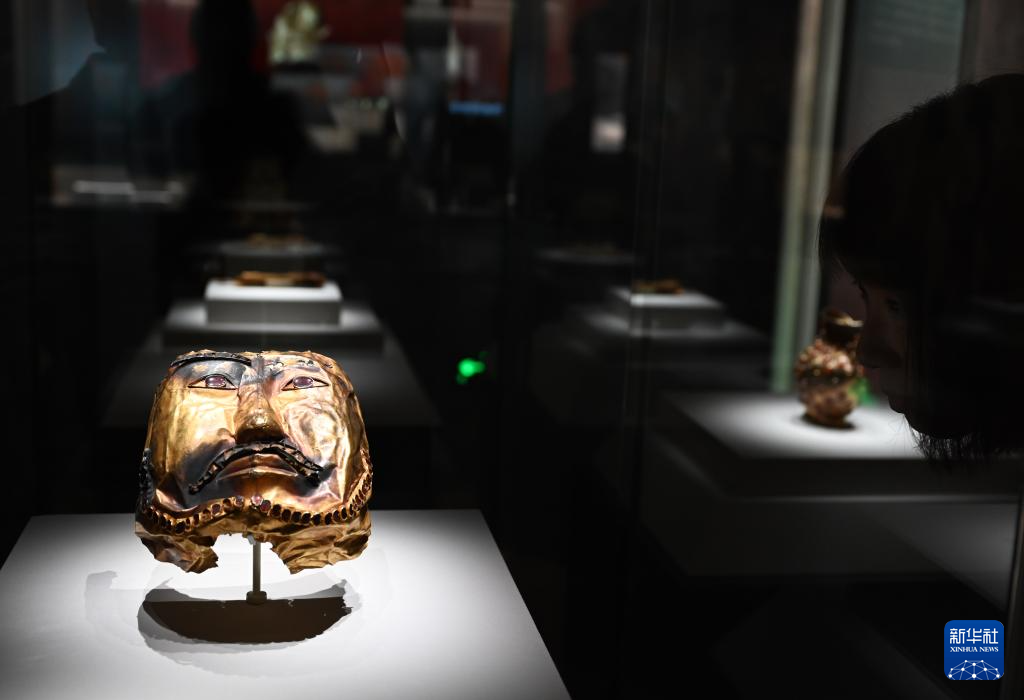 这是展出的镶嵌红宝石金面具(6月16日摄)。