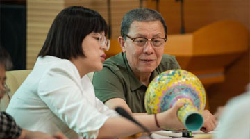 黄俊军在观看自己的铜雕作品《群仙祝寿图》(7月13日摄)。