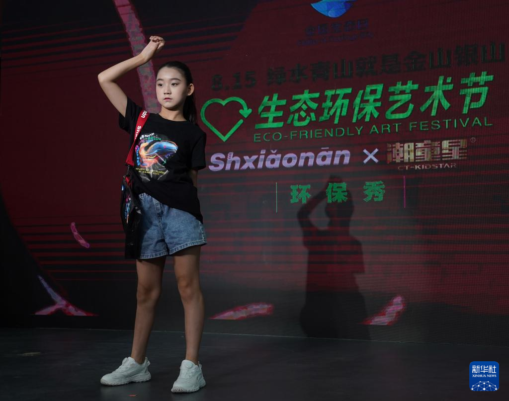 8月15日,模特在艺术节开幕式上展示用废弃布料设计制作的礼服。