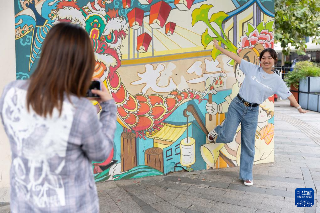 10月9日,市民在上海光华创意街区一处艺术涂鸦墙前拍照。