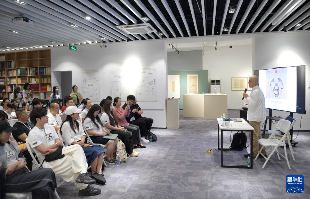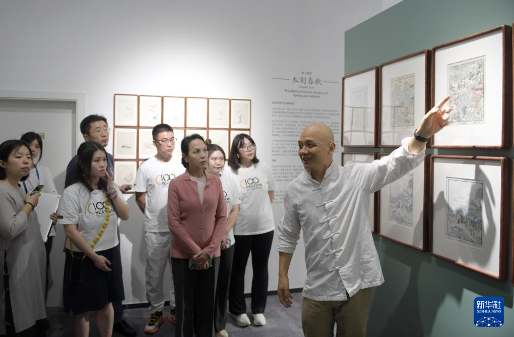 当日,十竹斋木版水印艺术作品展在暨南大学广州石牌校区举行。国家非遗项目木版水印技艺代表性传承人魏立中在展览现场为学生导赏、授课,并指导学生体验木版水印手作的乐趣。