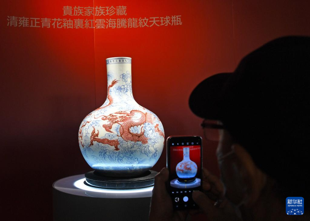 11月24日,在香港会议展览中心,观众拍摄清雍正青花釉里红云海腾龙纹天球瓶。