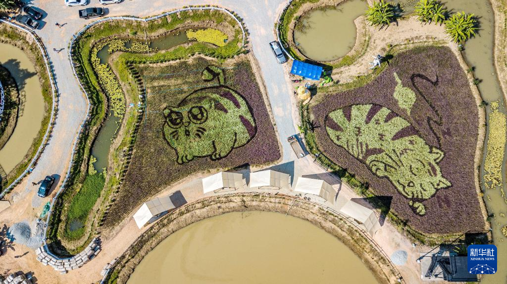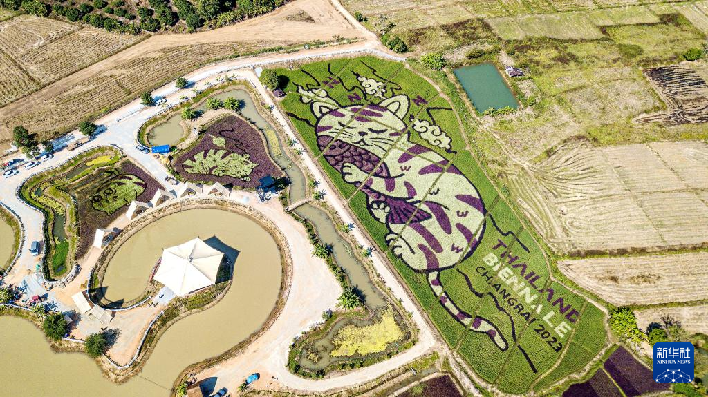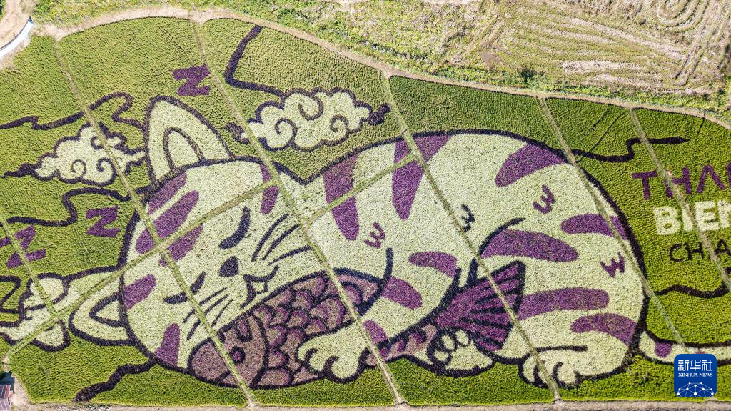 近日,泰国清莱艺术家在当地稻田中创作了三幅以猫为图案的巨型稻田画,吸引游人前来观看。
