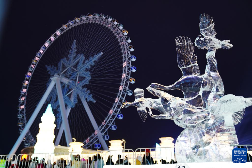 1月4日,在哈尔滨冰雪大世界园区内,游客观赏中国选手参赛冰雕作品《天使的爱》。