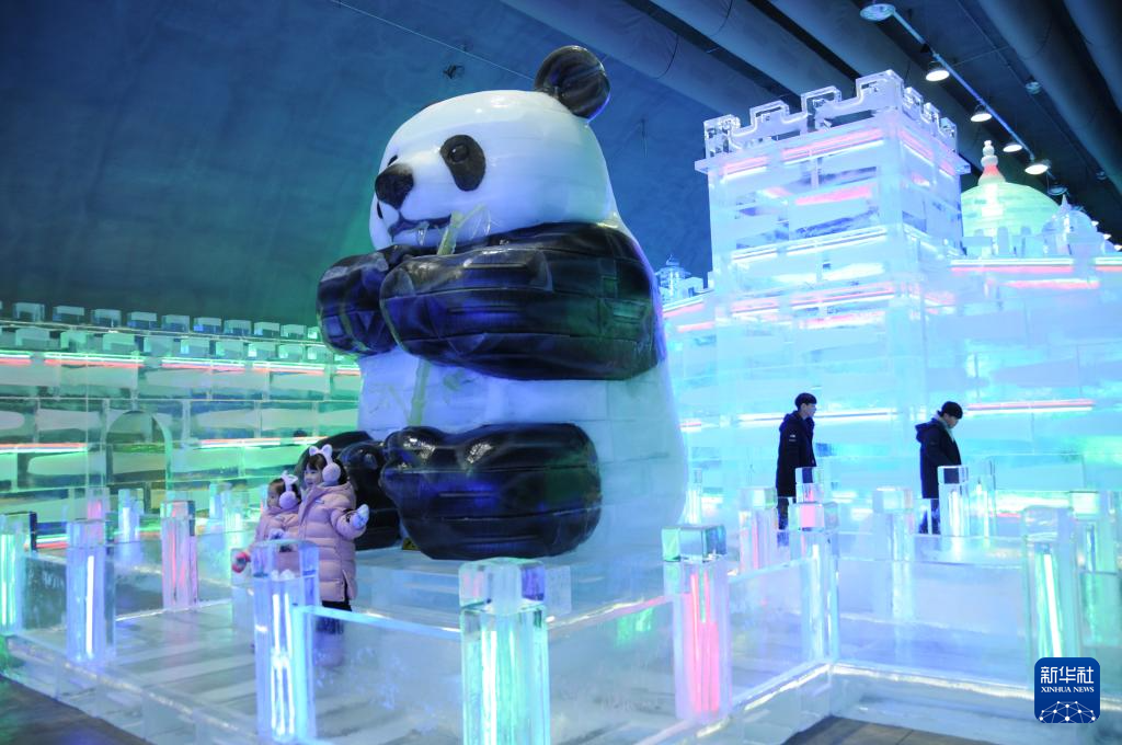 1月13日,在韩国江原道的华川山鳟鱼节现场,游客在哈尔滨工匠制作的大熊猫冰雕作品前留影。
