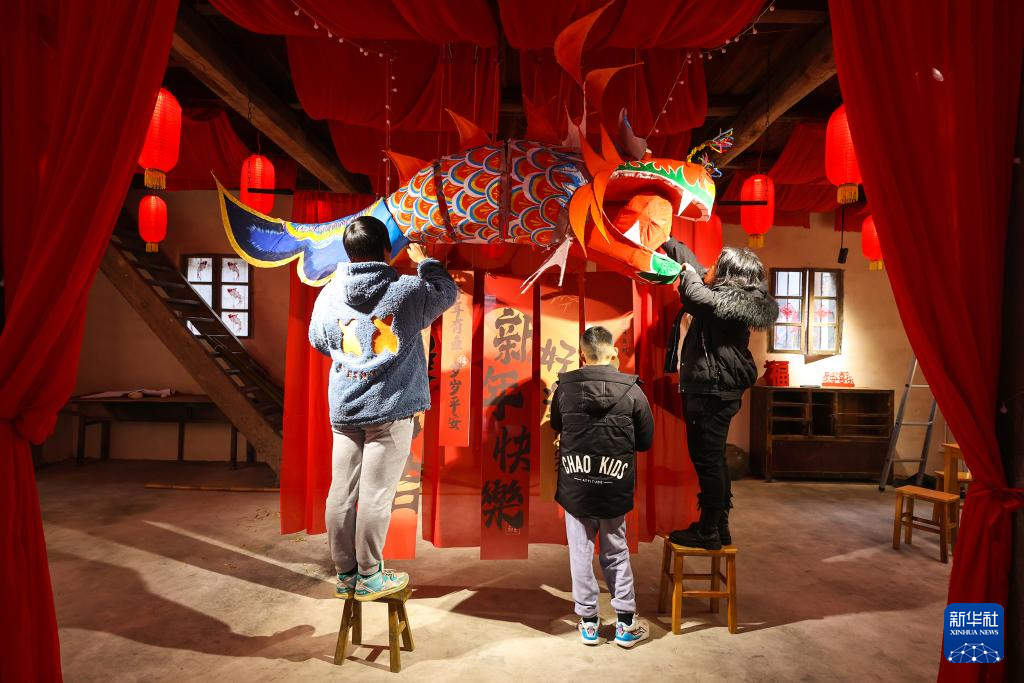 2月6日,黄山市歙县瞻淇村村民在布置鱼灯馆。