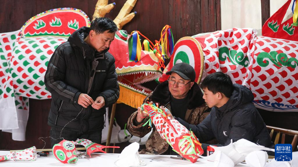 2月6日,黄山市歙县瞻淇村的鱼灯制作技艺传承人汪观海(中)在制作鱼灯。
