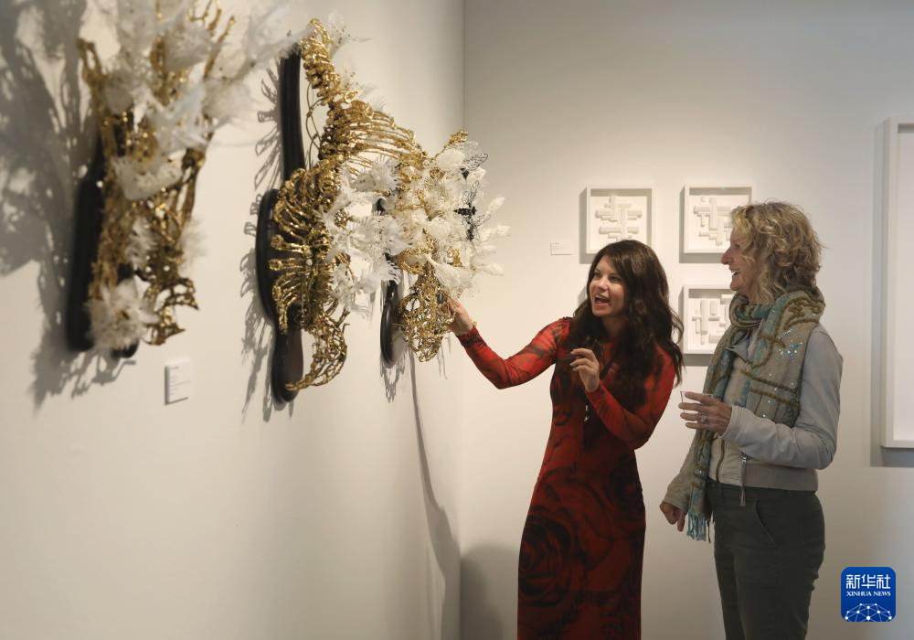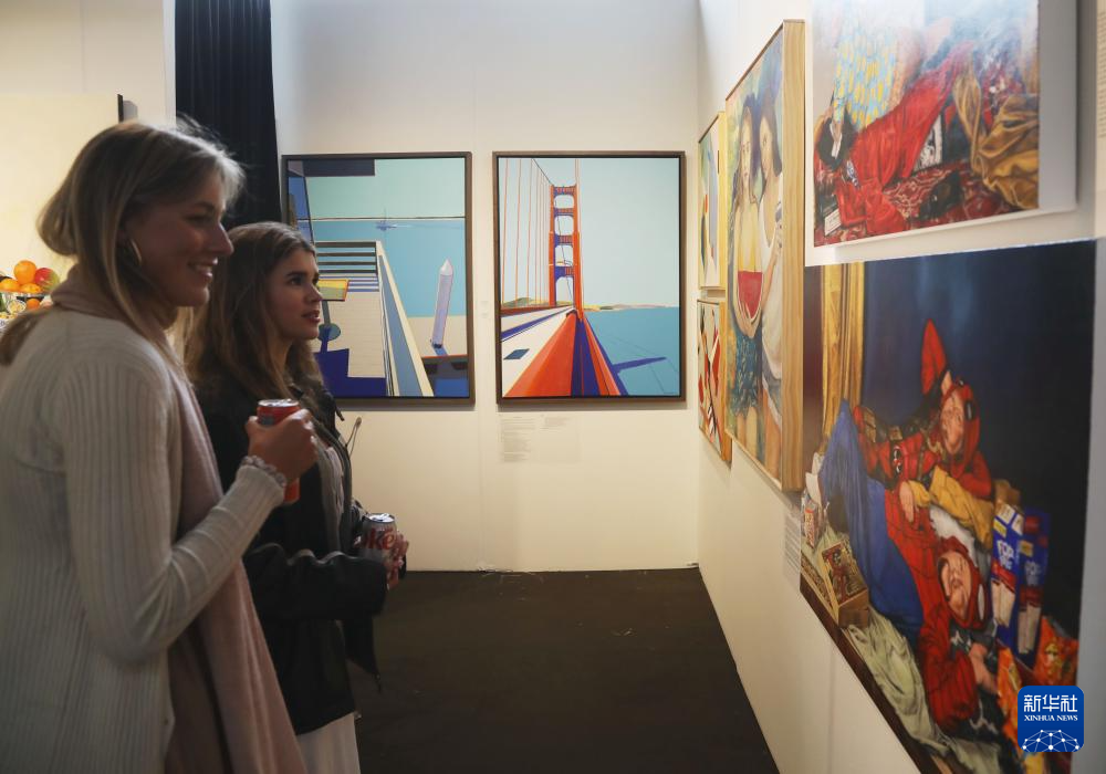 4月25日,在美国旧金山梅森堡中心举行的旧金山艺术博览会上,人们观看艺术作品。