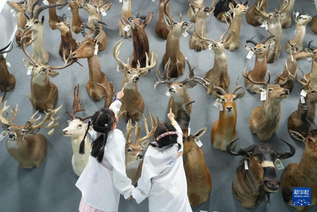 5月18日,在位于重庆市北碚区的重庆自然博物馆珍品库房,小朋友们在参观动物标本。