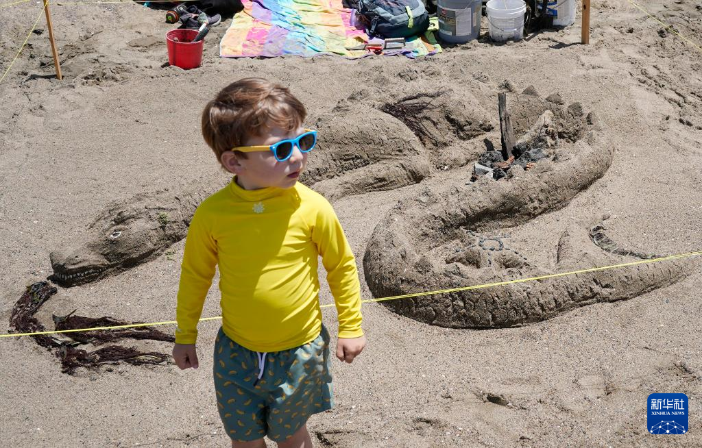 6月1日,一名男孩站在美国加利福尼亚州阿拉米达县的一处沙雕作品前。