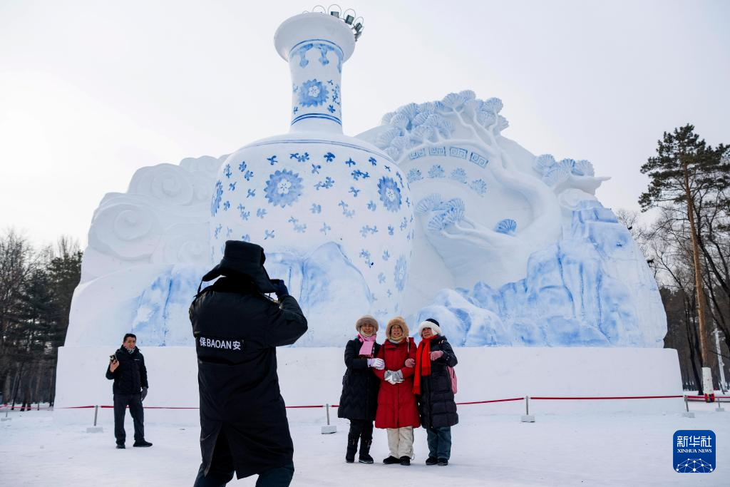 1月13日,在哈尔滨太阳岛雪博会园区,游客在大型雪雕《雪韵国粹青花瓷》下留影。