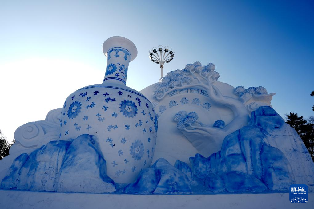 这是1月11日在第37届太阳岛国际雪雕艺术博览会上拍摄的雪雕作品《雪韵国粹青花瓷》。