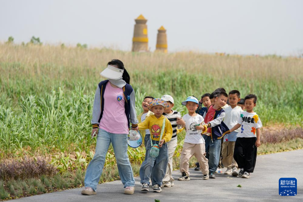 4月17日,在湖南省岳阳市君山区微笑绿洲生态营地,老师带着学生在芦苇艺术季活动现场研学。