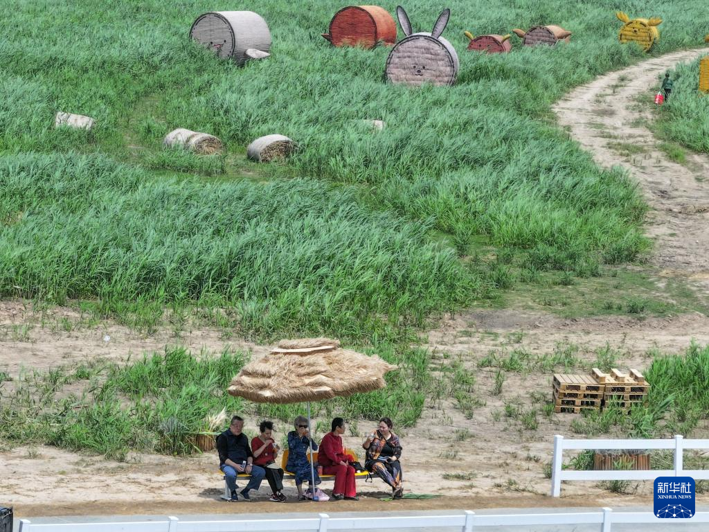 4月17日,在湖南省岳阳市君山区微笑绿洲生态营地,游客在芦苇艺术季活动现场休闲(无人机照片)。