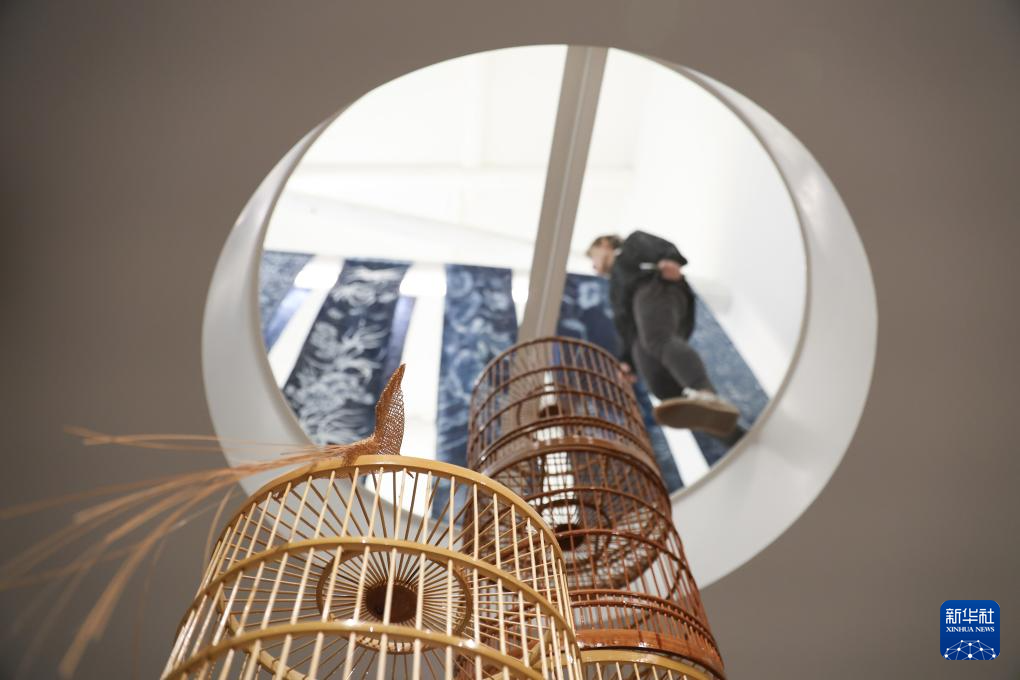 这是4月13日在意大利米兰设计周贵州工业设计城展区拍摄的竹编工艺展品。
