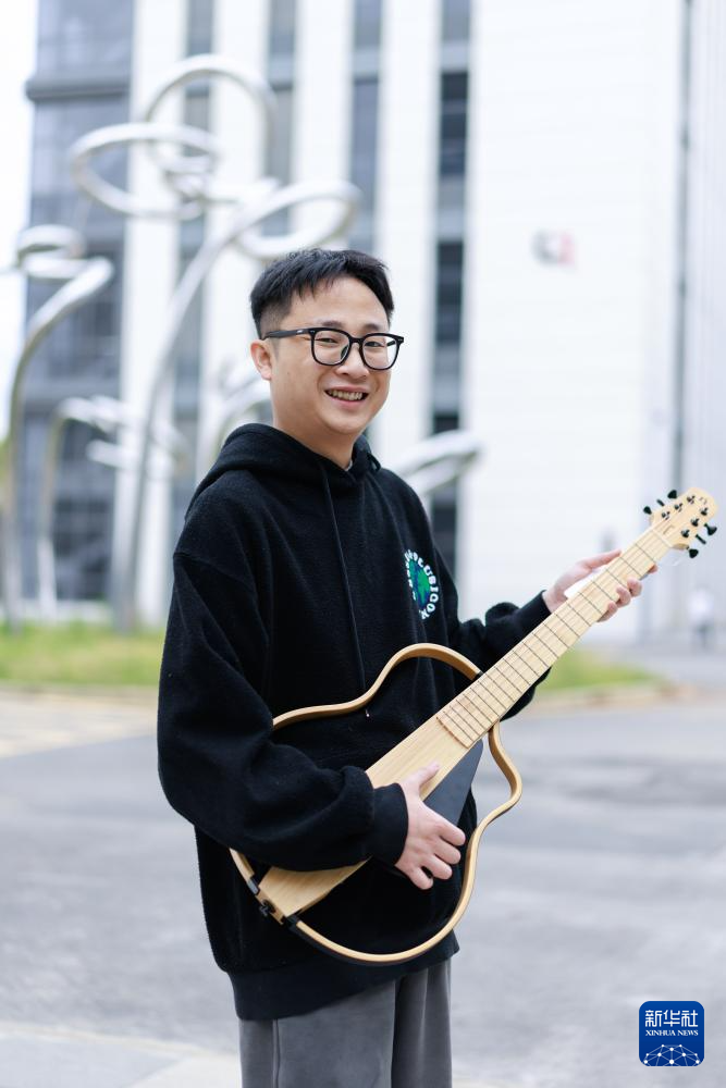 4月22日,设计师在贵州工业设计城内展示竹电吉他。