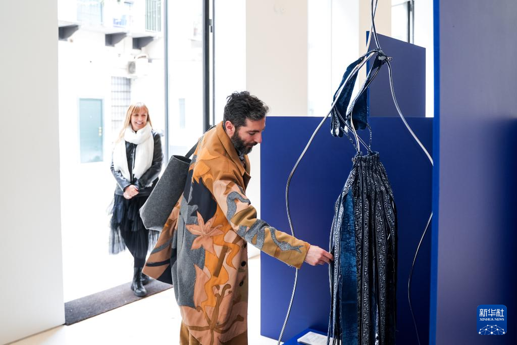 4月13日,在意大利米兰,参展嘉宾观看米兰设计周贵州工业设计城展区陈列的运用贵州蜡染工艺制作的牛仔裙。