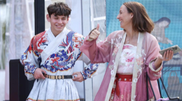 5月12日,游客在改扩建后的西安碑林博物馆北区场馆进行互动体验。