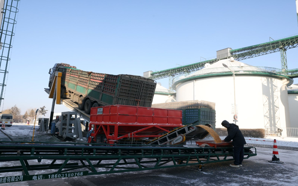 图为中储粮哈尔滨直属库利用液压翻板机卸粮。