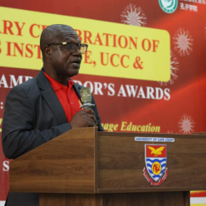 12月15日,在加纳海岸角市,加纳国家课程与评估委员会理事会主席文森特·阿桑富尔在海岸角大学孔子学院成立10周年庆典上致辞。