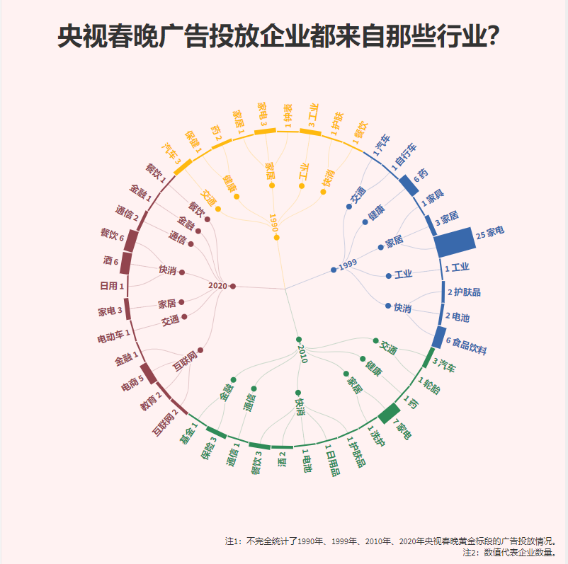 有人把春晚稱作“中國(guó)經(jīng)濟(jì)的晴雨表”,認(rèn)為它一定程度上反映了中國(guó)經(jīng)濟(jì)的發(fā)展。如果細(xì)數(shù)贊助商廣告企業(yè)所屬的行業(yè),可以一窺其變化路徑。