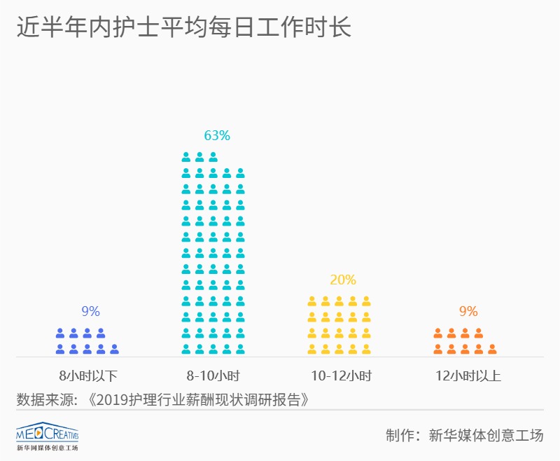2019年8月,醫(yī)學(xué)界傳媒發(fā)布《2019護(hù)理行業(yè)薪酬現(xiàn)狀調(diào)研報(bào)告》,報(bào)告顯示91%的護(hù)士每日工作8小時(shí)以上,近三成護(hù)士每日工作超過(guò)10小時(shí),其中超過(guò)12小時(shí)占比9%,大部分護(hù)士每日工作時(shí)間在8—10小時(shí)。