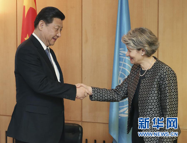 ????新華網(wǎng)巴黎3月27日電(記者尚栩 劉華)國(guó)家主席習(xí)近平27日在巴黎聯(lián)合國(guó)教科文組織總部會(huì)見(jiàn)該組織總干事博科娃。