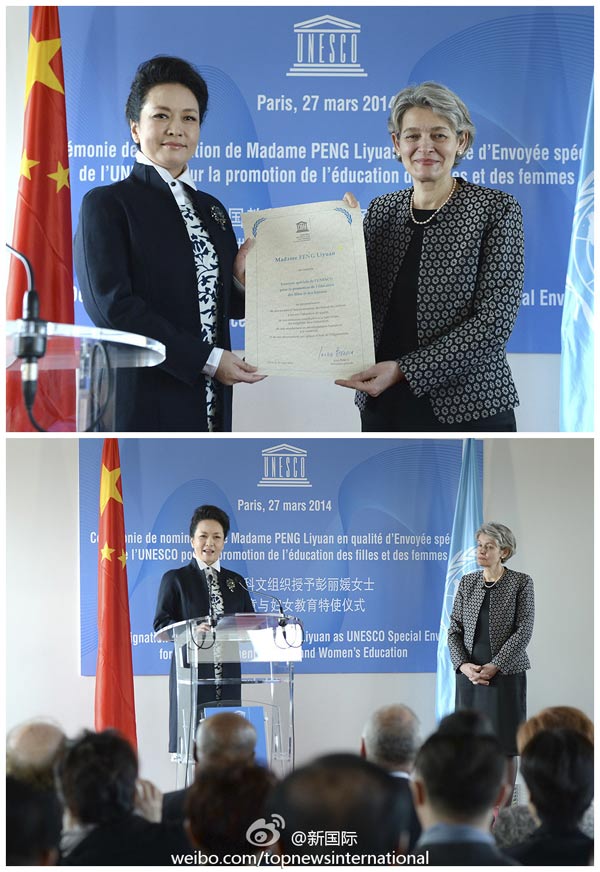 ????新華網北京3月27日電 據(jù)新華社“新國際”微博報道,習近平主席夫人彭麗媛27日在巴黎聯(lián)合國教科文組織總部被授予“促進女童和婦女教育特使”榮譽稱號。從博科娃總干事手中接過證書后,彭麗媛說,這是一項崇高的事業(yè),我愿意盡我所能,幫助更多孩子,為更多姐妹爭取接受教育的權利。