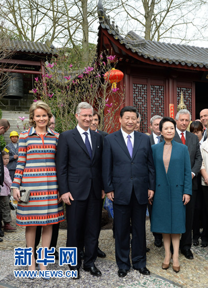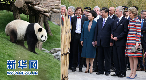 ????習近平和夫人彭麗媛抵達時,受到菲利普國王和瑪蒂爾德王后、比利時首相迪呂波熱情迎接。兩國領導人一同步入中國園。亭臺樓閣、雕梁畫棟、鳥語花香,這里宛如一幅恬靜祥和的中華寫意畫。兩國元首夫婦沿著回廊曲徑,穿過青翠竹林,前往大熊貓園。他們邊走邊談,回顧中比兩國友好交往。