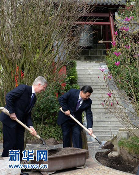 ????3月30日,國家主席習近平和比利時國王菲利普共同出席比利時天堂公園大熊貓園開園儀式。這是習近平與菲利普國王共同為一棵象征友誼的玉蘭樹培上新土。 新華社記者 馬占成 攝