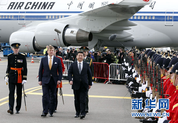 ??? 3月22日,國家主席習(xí)近平抵達阿姆斯特丹,應(yīng)荷蘭國王威廉-亞歷山大邀請,對荷蘭進行國事訪問,開啟歐洲之旅。威廉-亞歷山大在機場為習(xí)近平舉行隆重歡迎儀式。這是習(xí)近平在威廉-亞歷山大陪同下檢閱儀仗隊。新華社記者 鞠鵬 攝