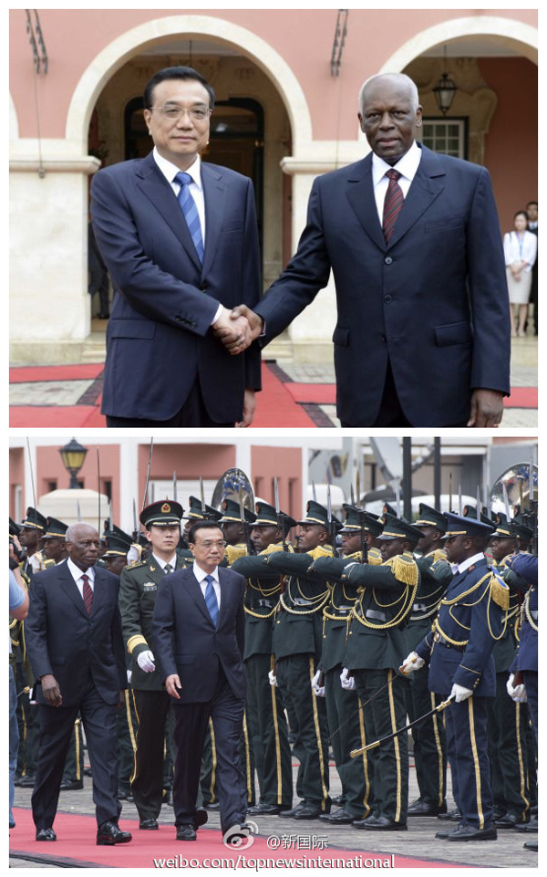 ????新華網(wǎng)北京5月9日電? 據(jù)新華社“新國際”微博報(bào)道,5月9日,國務(wù)院總理李克強(qiáng)在羅安達(dá)總統(tǒng)府出席安哥拉總統(tǒng)多斯桑托斯舉行的歡迎儀式。李克強(qiáng)總理在多斯桑托斯總統(tǒng)陪同下檢閱了儀仗隊(duì)。