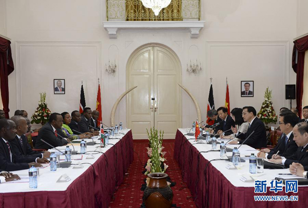 ????李克強(qiáng)指出,中肯全方位、寬領(lǐng)域、多層次互利合作面臨新的發(fā)展機(jī)遇。希望雙方發(fā)揮好中肯經(jīng)貿(mào)聯(lián)委會機(jī)制作用,加強(qiáng)對務(wù)實(shí)合作的規(guī)劃、指導(dǎo)和協(xié)調(diào),深化貿(mào)易、投資、金融、能源等領(lǐng)域合作。中方愿增加自肯進(jìn)口,鼓勵中國企業(yè)擴(kuò)大對肯投資,并充分發(fā)揮在鐵路、港口、機(jī)場、電站建設(shè)和運(yùn)營方面的經(jīng)驗(yàn)和技術(shù)優(yōu)勢,與肯方開展基礎(chǔ)設(shè)施建設(shè)等合作;發(fā)揮肯尼亞交通樞紐優(yōu)勢,合作進(jìn)行區(qū)域航空支線運(yùn)營和鐵路網(wǎng)絡(luò)建設(shè);加強(qiáng)農(nóng)業(yè)合作,促進(jìn)糧食安全;加強(qiáng)生態(tài)環(huán)境和野生動物保護(hù)合作,促進(jìn)可持續(xù)發(fā)展;擴(kuò)大人文交流,共同實(shí)施好中非聯(lián)合研究中心項目,為促進(jìn)肯及非洲國家科技進(jìn)步作出貢獻(xiàn)。