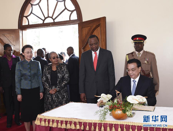 ??? 5月10日,中國國務(wù)院總理李克強(qiáng)在肯尼亞國家宮同肯總統(tǒng)肯雅塔舉行會談。這是會談開始前,李克強(qiáng)在貴賓簿上簽名。 新華社記者 李學(xué)仁 攝