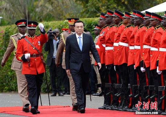 5月10日,中國國務院總理李克強在肯尼亞總統(tǒng)府廣場出席肯總統(tǒng)肯雅塔舉行的歡迎儀式。中新社發(fā) 劉震 攝