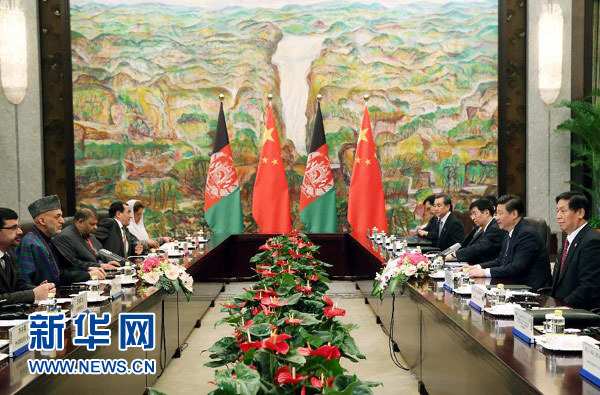 ????卡爾扎伊表示,阿中兩國有著兄弟般深厚的友誼,中國是阿富汗信賴的好鄰居。阿方感謝中方給予阿富汗和平重建的寶貴支持。無論阿富汗大選結(jié)果如何,阿方?jīng)Q心同中方發(fā)展親密的睦鄰友好關(guān)系,希望中方繼續(xù)幫助阿富汗實(shí)現(xiàn)穩(wěn)定、和解、發(fā)展,幫助阿富汗培訓(xùn)各類人才??植乐髁x、跨國犯罪是阿中兩國共同的敵人,阿方愿同中方合力打擊。